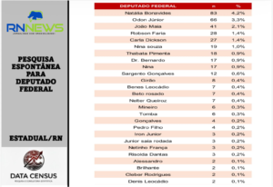 A pesquisa Data Census, divulgada nesta quarta-feira (22), trouxe citações ao nome de Netinho França. O macaibense aparece entre os mais lembrados para deputado federal na pesquisa espontânea.